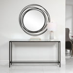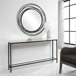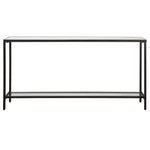 - Classic And Minimalistic, This Narrow Console Table In Steel Is Finished With A Streamlined Rustic Black, Inset With A Beveled Mirrored Top, And Gallery Shelf In Clear Glass.