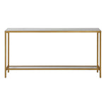 • Classic And Minimalistic, This Narrow Console Table In Iron Is Finished With Lightly Antiqued Gold Leaf, Inset With A Beveled Mirrored Top, And Gallery Shelf In Clear Glass.