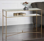- An Elegant Silhouette In Iron With A Cross Stretcher Accent Finished In Gold Leaf With Heavy Antiquing. Top Is Reinforced Mirror And Gallery Shelf Is Clear Tempered Glass.