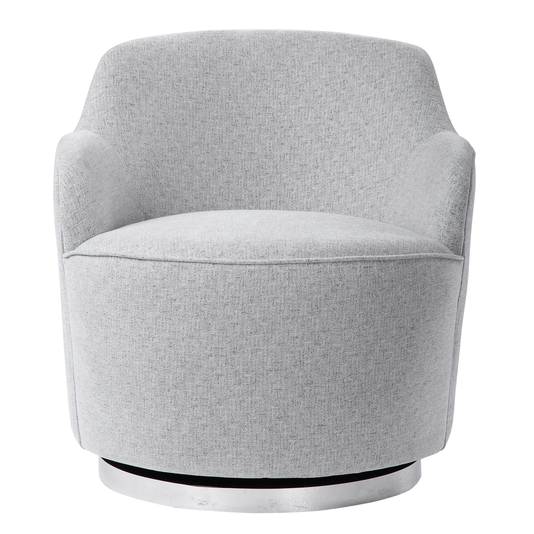 - Casually Sloped For Maximum Comfort, This Accent Chair Is Tailored In Light Gray With Charcoal Graining. Rests On A Stainless Steel Plinth Swivel Base, Finished In Polished Nickel.