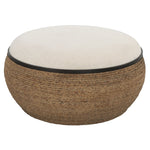 - A Unique Blend Of Casual And Coastal Styles, This Ottoman Is A Versatile Storage Piece With A Removable Lid. Can Be Used As Seating, A Footrest, Or Cocktail Table. The Round Base Is Wrapped In Natural Braided Straw With Matte Black Iron Details And A Plush Upholstered Seat In Light Beige Performance Fabric.