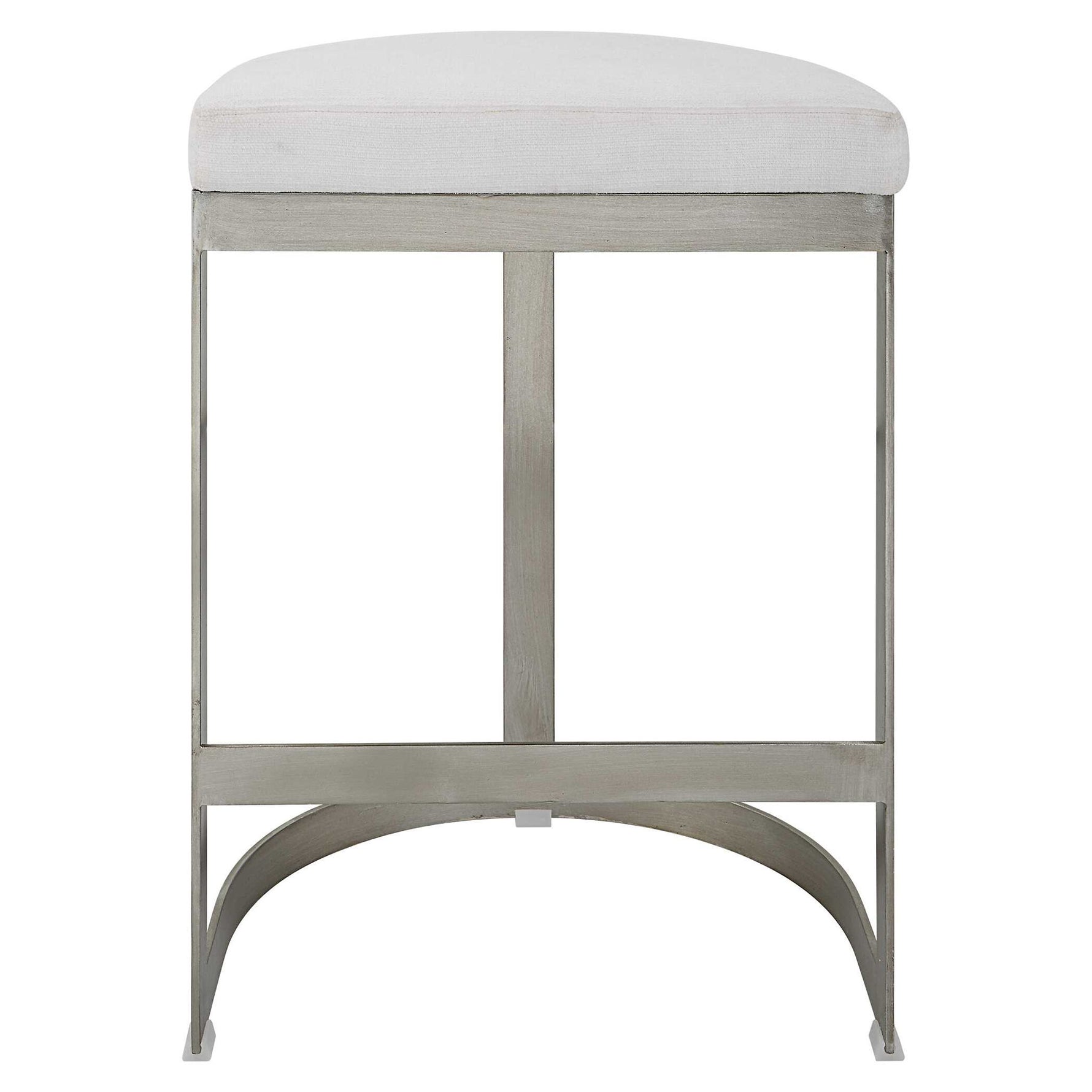 - Simplistic But Sturdy, This Statement Counter Stool Features A Thick Hand Forged Iron Base Finished In Brushed Silver. Plush Seat Is Tailored In A White Linen Blend Performance Fabric.