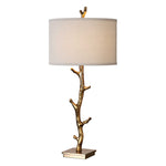 Cast From An Authentic Tree Branch, Finished In A Plated Antiqued Gold, Sitting On A Coordinating Steel Foot. The Round Hardback Drum Shade Is An Ivory Linen Fabric.
