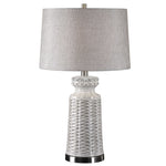 Embossed Ceramic, Featuring A Subtle Tribal Pattern, Finished In A Lightly Distressed Glossed White Glaze, Accented With Brushed Nickel Plated Details. The Slightly Tapered Round Hardback Shade Is A Light Gray-beige Linen Fabric. Due To The Nature Of Fired Glazes On Ceramic Lamps, Finishes Will Vary Slightly.