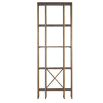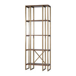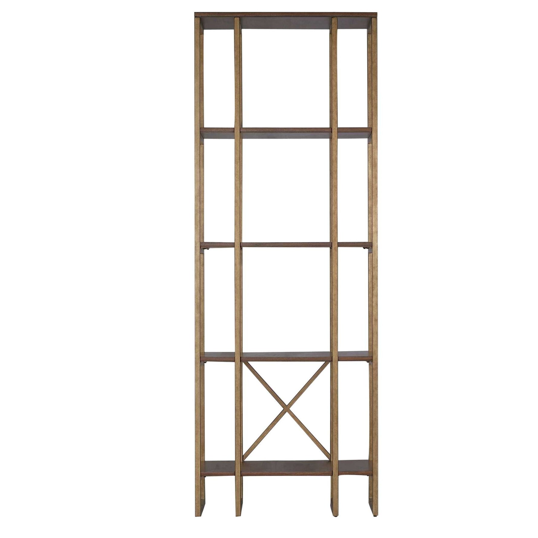 - Easily Display Items On This Transitional Etagere, Finished In A Brushed Antique Gold And Accented By Four Acacia Veneer Fixed Shelves In A Rich Dark Walnut Stain.