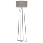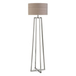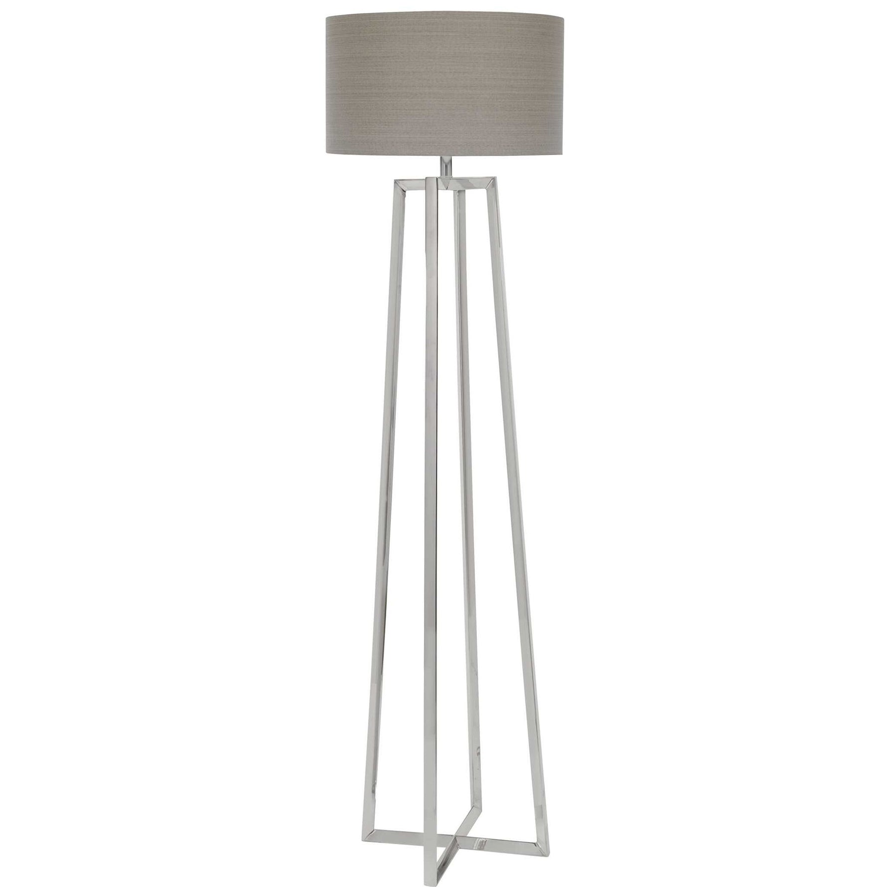 Slightly Tapered In Stature These Triangular Shaped Legs Are Crafted Out Of Polished Stainless Steel. The Round Hardback Drum Shade Is A Textured, Taupe-gray Linen Fabric.