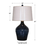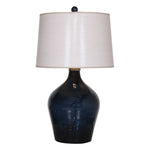 Lightly Hammered, Midnight Blue Glass Accented With Polished Nickel Plated Details. The Round, Tapered, Hardback Shade Is A Beige Linen Fabric With Light Slubbing.