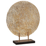 • Clear, Rippled Art Glass Charger Featuring A Subtle Crosshatch Texture On The Reverse With Bright Gold Accents Displayed On A Bronze, Steel Stand With Black Marble Base.