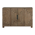 Geometric Parquetry Style Console, With Rustic Two-toned Fir Veneer And Old Iron Bar Pulls. Center Portion Opens To Two Fixed Interior Shelves.