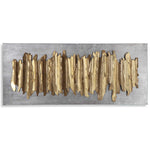 - Iron Wall Art Featuring Layers Of Metal Strips With Crude Edging, Finished In An Antique Gold Leaf And Set On A Distressed Silver Leaf Iron Backing. May Be Hung Horizontal Or Vertical.