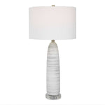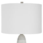 This Sleek Ceramic Table Lamp Features A Matte White Glaze With Brushed Light Gray Detailing, Paired With Brushed Nickel Plated Accents And A Crystal Foot. A White Fabric Drum Shade Compliments The Piece.