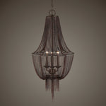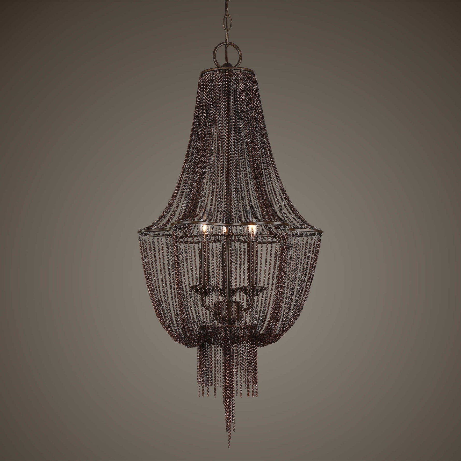 Draped Jewelry Chain Finished In A Dark Oil Rubbed Bronze With Gold & Copper Highlights. 3-60 Watt Max, Candelabra Sockets. Bulbs Not Included. Supplied With 15' Wire & 7' Chain For Adjustable Installation.