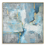 Evoking A Mid-century Modern Style, This Hand Painted Abstract On Canvas Makes A Bold Statement. Bright Blue Shades Are Complemented By Wide, White, And Gray Brushstrokes And Bright Gold Leaf Accents. A Petite, Gold Gallery Frame Surrounds The Canvas, Which Has Been Stretched And Applied To A Wooden Frame. Due To The Handcrafted Nature Of This Artwork, Each Piece May Have Subtle Differences. This Piece May Be Hung Horizontal Or Vertical.