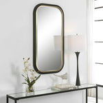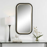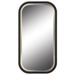 The Nevaeh Mirror Displays An Elegant Curved Profile With A Satin Black Finish, Accented With A Petite Gold Leaf Inner Edge. Mirror Features A Generous 1 1/4" Bevel. May Be Hung Horizontal Or Vertical.