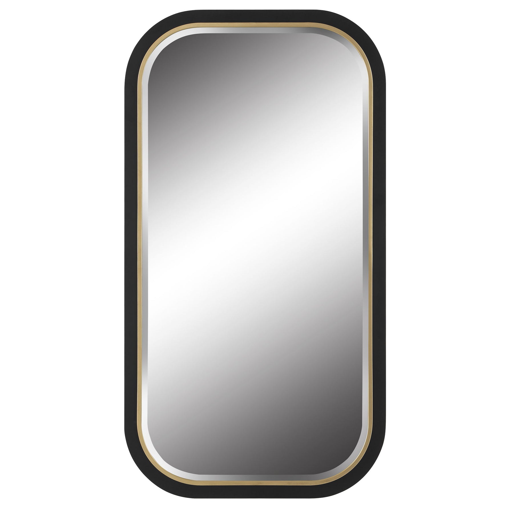 • The Nevaeh Mirror Displays An Elegant Curved Profile With A Satin Black Finish, Accented With A Petite Gold Leaf Inner Edge. Mirror Features A Generous 1 1/4" Bevel. May Be Hung Horizontal Or Vertical.