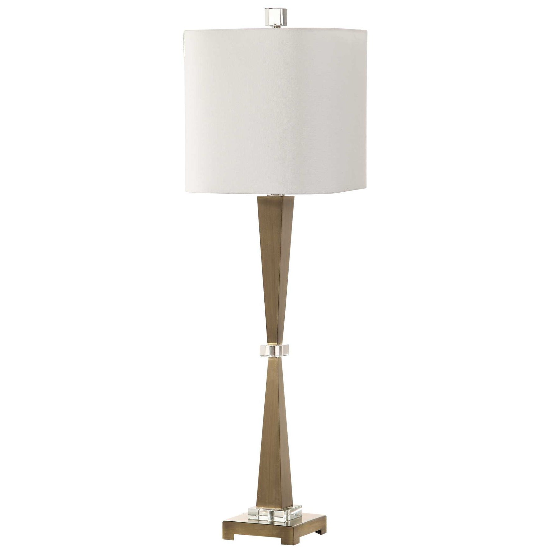 This Sleek Design Features Tapered Steel Columns, Finished In Plated, Lightly Antiqued Brushed Brass, Accented With Thick Crystal Details. The Square Hardback Shade Is A White Linen Fabric With Rolled Edges.