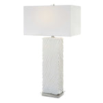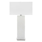 Stylish And Sophisticated, This Table Lamp Is Executed In A Rich Carved Ivory Man-made Stone That Accurately Replicates The Look Of Thasos Marble And Is Accented By Brushed Nickel Finished Iron Details. A Rectangle Hardback Shade In White Linen Complements The Design.