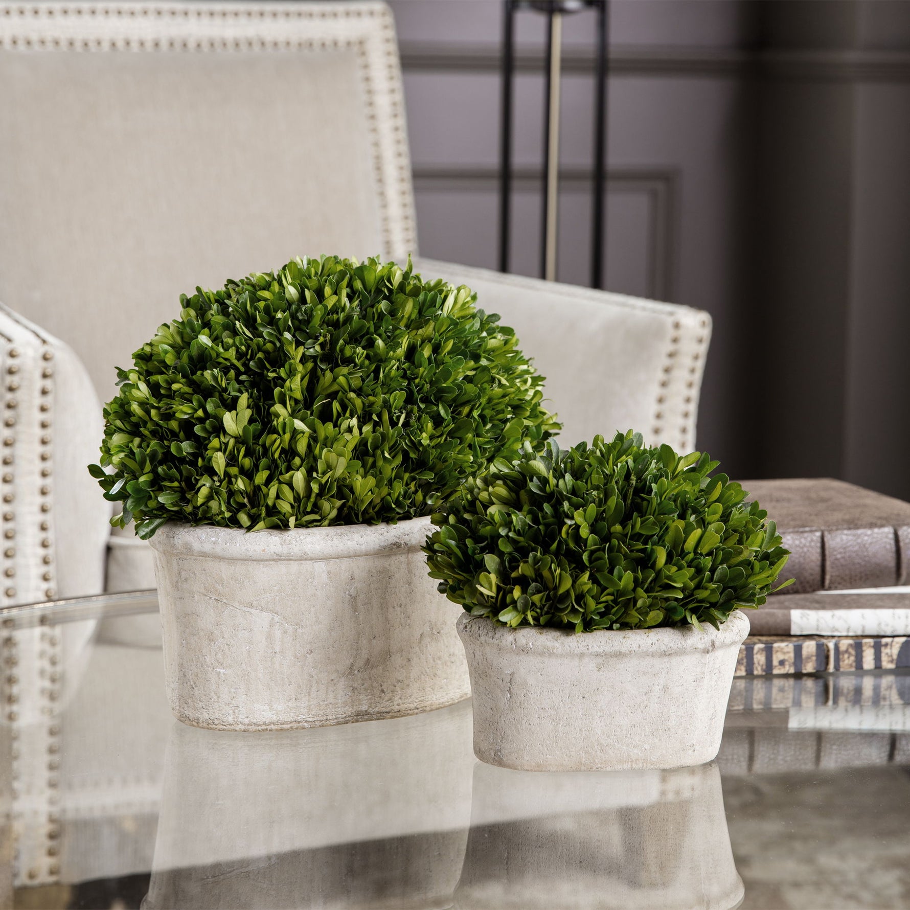 - Preserved While Freshly Picked, Natural Evergreen Foliage Looks And Feels Like Living Boxwood, Potted In Mossy Stone Finished, Terra Cotta Planters. Indoor Use Only.