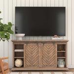 A Craftsman Built Media Piece Finished In Antique Honey Over Mango Veneer, Featuring Chevron Patterned Sliding Doors With Carved Molding Details And A Classic Bun Foot. Aged Black Iron Sliding Hardware Allows For Concealing Or Revealing Multiple Storage Options. Each Side Has Two Adjustable Shelves, With Two Fixed Shelves In The Center.