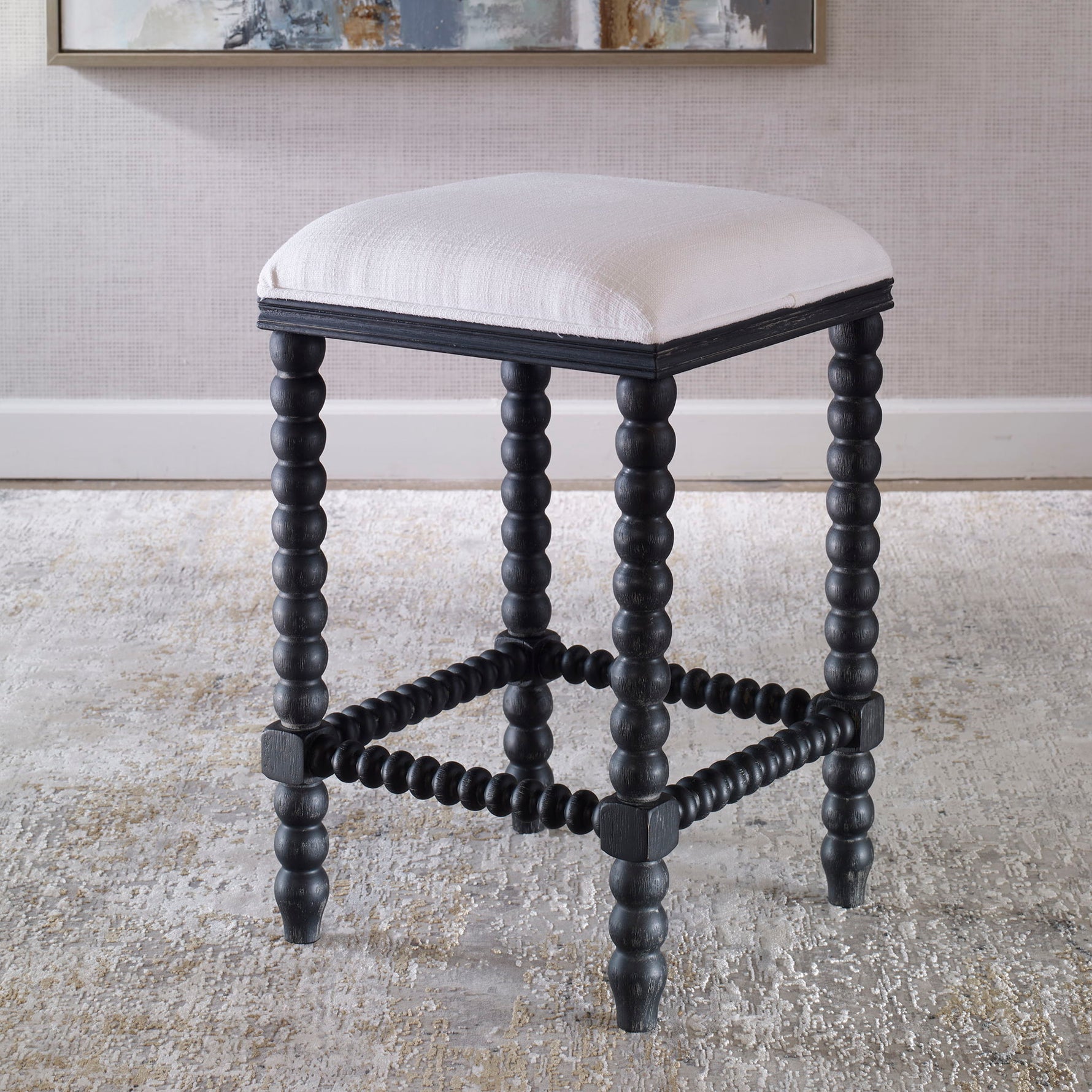 A Stylish And Classic Counter Stool Featuring Spindle Turned Legs And Carved Trim Finished In A Stylish Black Ceruse Stain. Plush Seat Is Tailored In A Crisp White Performance Fabric.