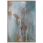 This Hand Painted Abstract Artwork Features A Largely Blue And Green Canvas Accented By Shades Of White, Terra Cotta, Taupe And Gold Leaf With Noticeable Texture. A Silver Leaf Gallery Frame Accents The Piece. Due To The Handcrafted Nature Of This Artwork, Each Piece May Have Subtle Differences. This Piece May Be Hung Horizontal Or Vertical.