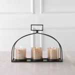 - Taking Cues From Moroccan Style, This Triple Candleholder Is Finished In Dark Bronze With Gold Rub-through Details And Textured, Smoked Glass Hurricanes. Three, White 3"x 3" Candles Are Included.