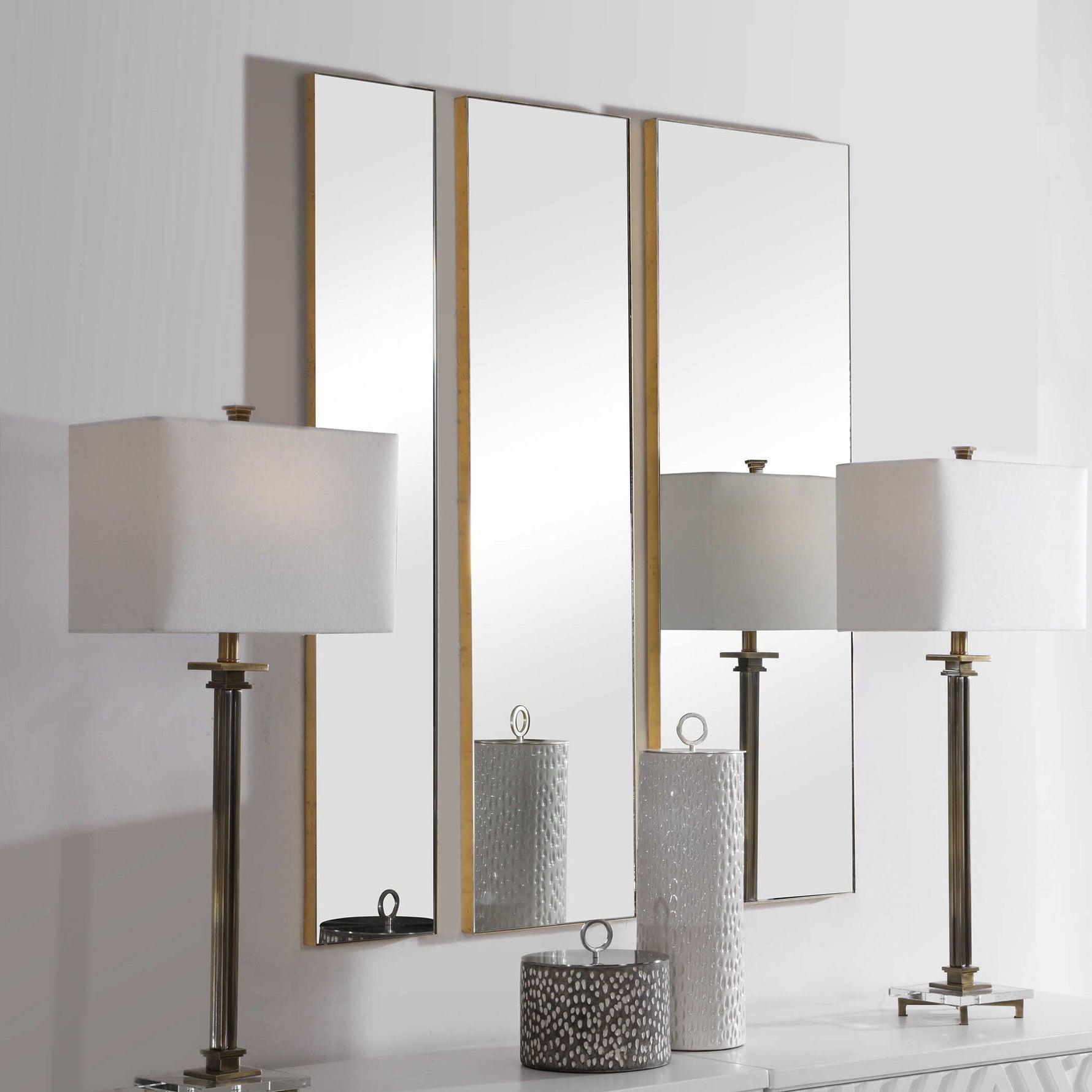 This Set Of Three Mirrors Showcase Simple, Clean Lines With Gold Leaf Finished Metal Profile Frames. Each Mirror May Be Hung Horizontal Or Vertical, Allowing For Multiple Modern Display Options. Sizes: S-8"x47", M-12"x47", L-16"x47"