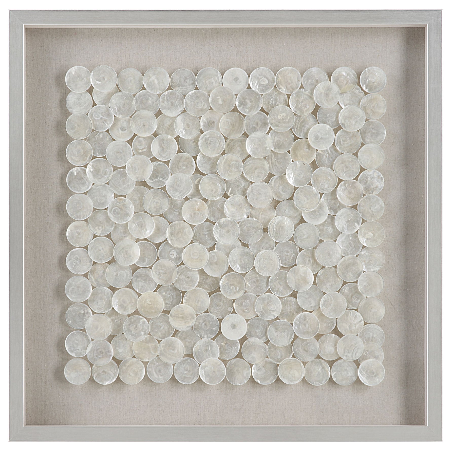 - Known As The Windowpane Oyster For It's Transparent Qualities, The Natural Layered Capiz Shells Shimmer In This Shadow Box Style Wall Piece. Placed Over A Flax Toned Linen Backing In A Pine Wood Frame Finished In Brushed Silver.