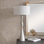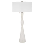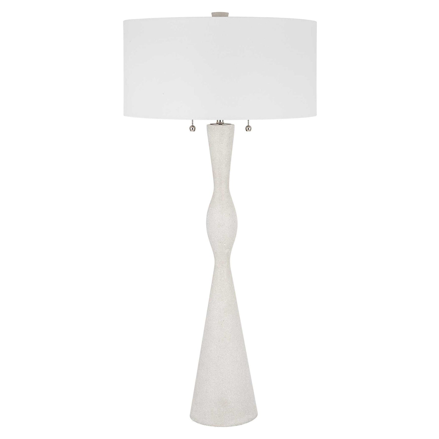 This Table Lamp Showcases An Eloquent Silhouette That's Crafted From Ivory Man-made Stone That Accurately Replicates The Look Of Thasos Marble, Accented With Iron Details Finished In Polished Nickel. The Round Hardback Shade Is Covered In White Linen Fabric.