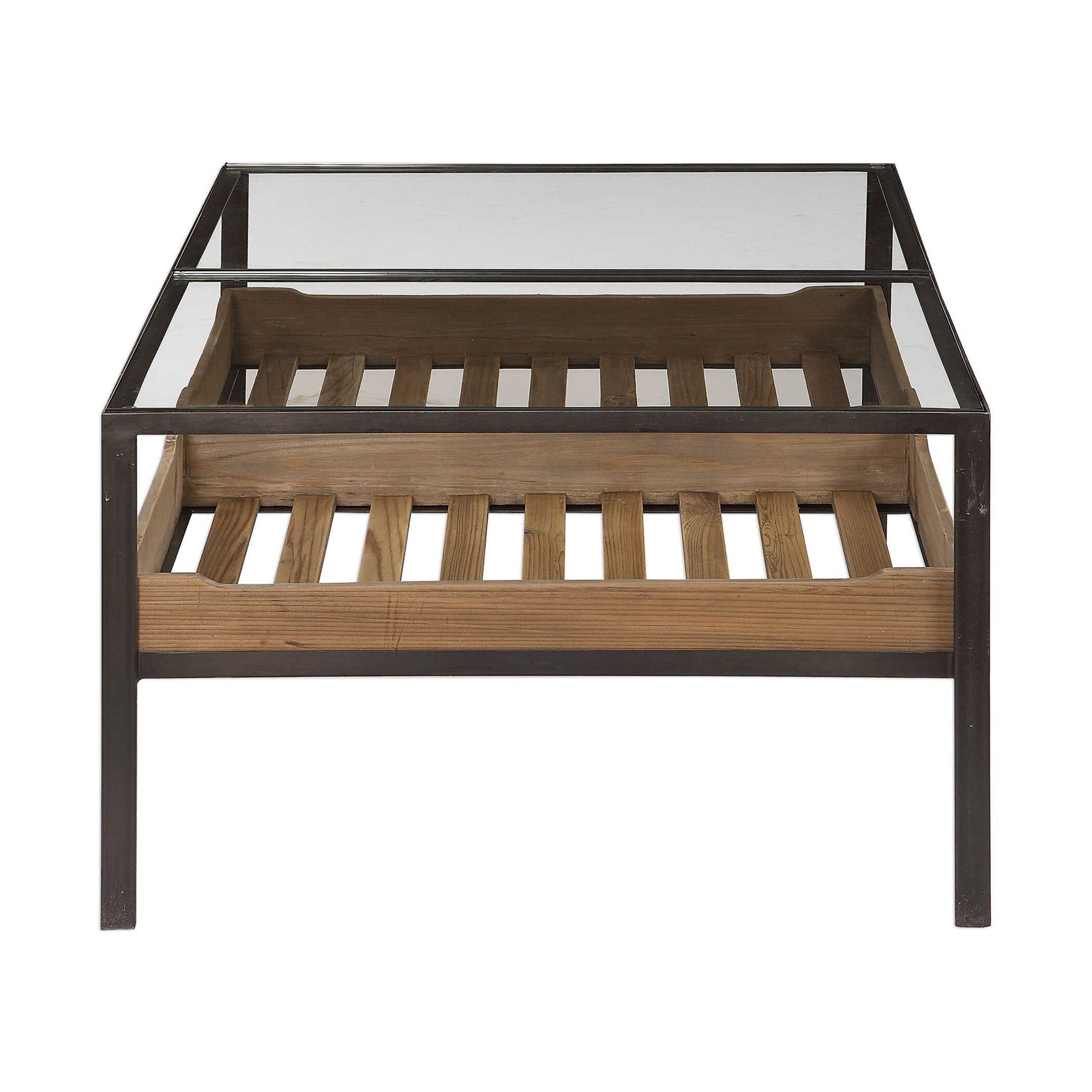 - A Versatile Look For Any Style Space, This Functional Table Features Two Slide Out Storage Trays Constructed From Solid Reclaimed Pine, Perfect For Storing Books Or Other Decorative Memorabilia. Iron Frame Is Finished In An Aged Steel With Two Drop-in Tempered Glass Tops. Solid Wood Will Continue To Move With Temperature And Humidity Changes, Which Can Result In Small Cracks And Uneven Surfaces, Adding To Its Authenticity And Character.