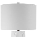 This Ceramic Table Lamp Showcases A Touch Of Mid-century Style With A Dimensional Geometric Design Finished In A Glossy White Glaze, Accented With Brushed Nickel Neck And A Crystal Finial. The Lamp Is Paired With A White Fabric Drum Shade.
