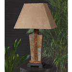This Indoor/outdoor Lamp Is Made Of Real Hand Carved Slate With Hammered Copper Details. The Rectangle Bell Shade Is A Brushed Suede, Weather Resistant Fabric. Due To The Natural Material Being Used Each Piece Will Vary.