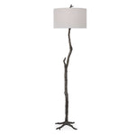 Drawing Inspiration From Nature, This Floor Lamp Is Handcrafted From Cast Iron With Sculpted Details Finished In Distressed Rustic Black And Subtle Silver Undertones. A Hardback Drum Shade In Light Gray Linen Fabric Accents The Piece.