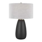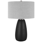 The Twilight Table Lamp Features A Ceramic Base With A Subtle Carved Gridline Texture, Finished In A Satin Black Glaze And Accented By Brushed Nickel Plated Details. The Hardback Drum Shade Is Covered In A Light Gray Linen Fabric.