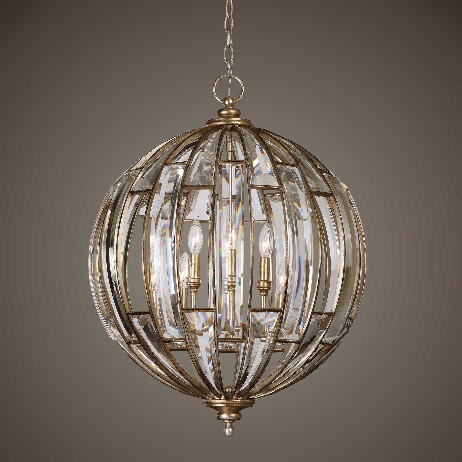 A Statement Of Sumptuous Elegance, A Sphere Of Beveled Crystals Enhanced With Burnished Silver Champagne Leaf Finish, Presenting A Modern Update Of Traditional Sophisticated Elements. 6-60 Watt Max, Candelabra Sockets. Bulbs Not Included. Supplied With 15' Wire And 7' Chain For Adjustable Installation.