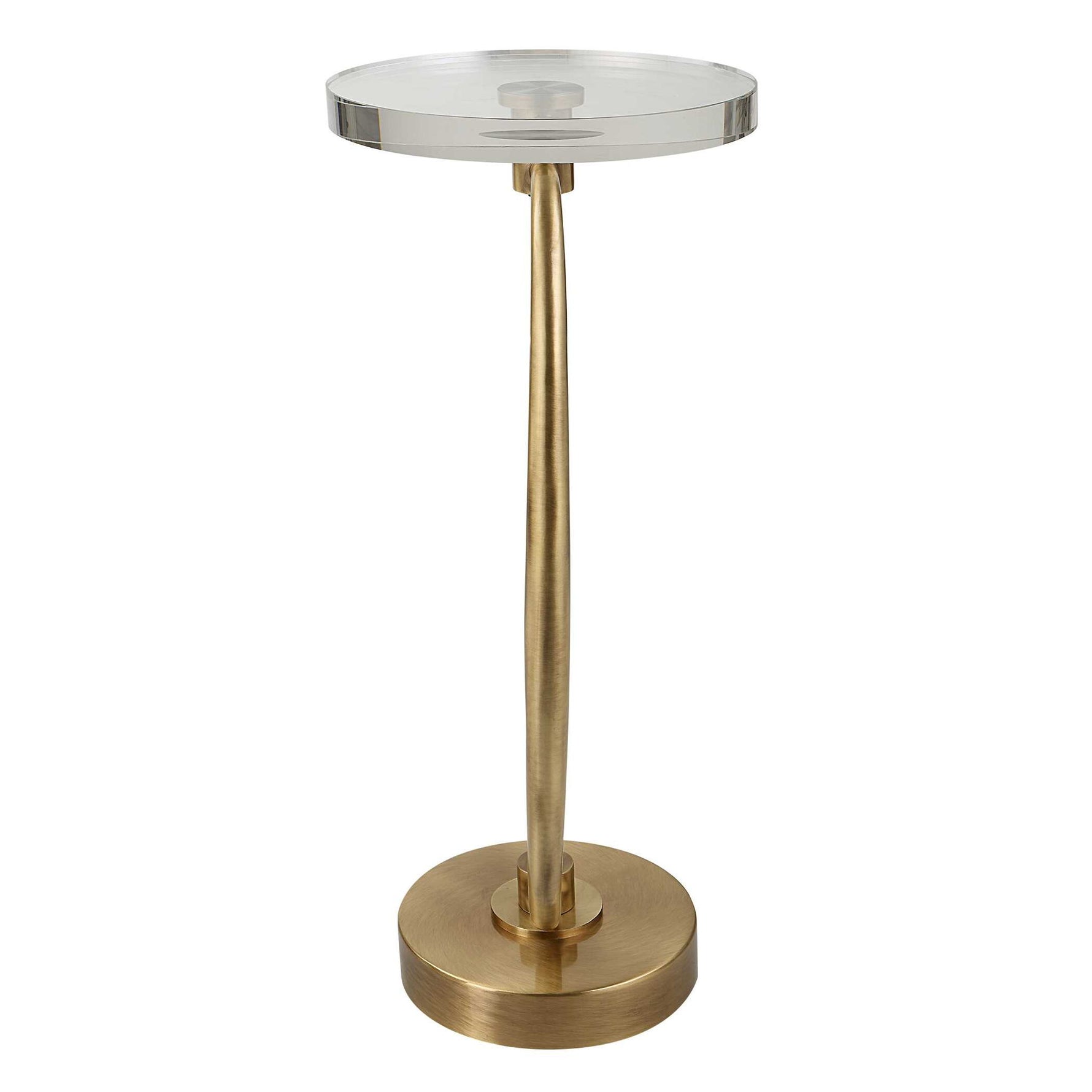 - Minimal Yet Sophisticated, The Waveney Drink Table Displays A Sleek Curved Iron Base In Antique Brass With Bronze Accents And A Thick Crystal Top.