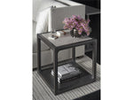 The Halen End Table exudes chic elegance with its slender, square form finished in the sophisticated Ravenwood hue, enhanced by an inset stone top that lends a polished and contemporary air to its sleek design.