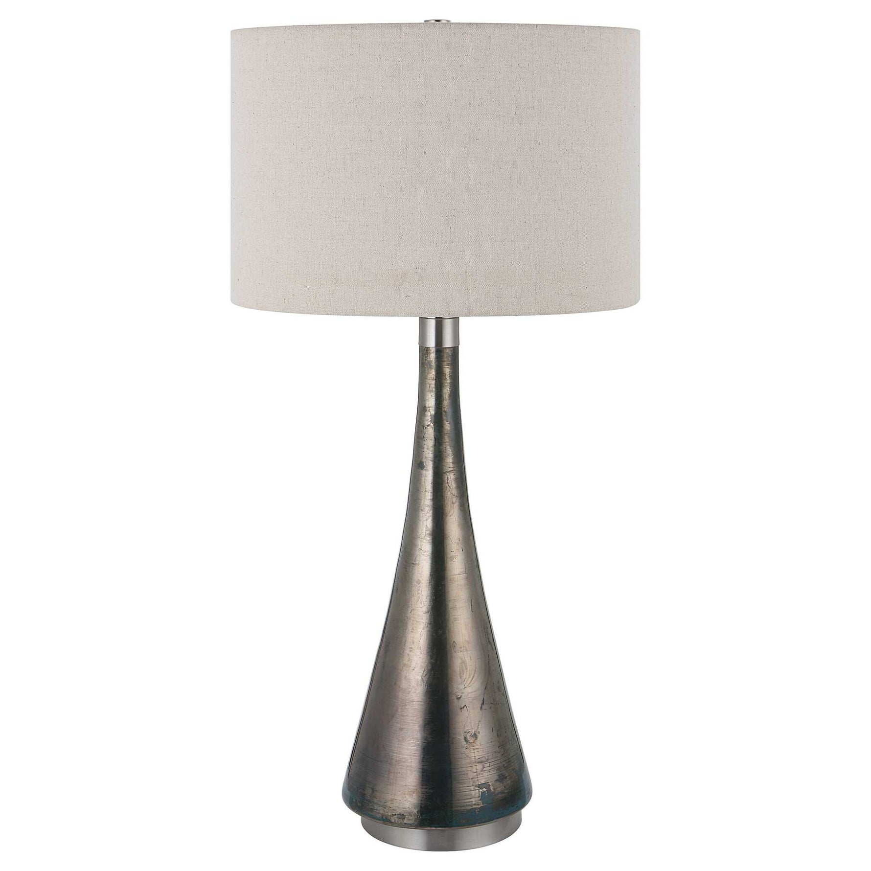 This Table Lamp Features A Graceful Tapered Base Crafted From Artisanal Blue-green Metallic Glass. Iron Accents Are Finished In Brushed Nickel. The Drum Shade Is Covered In A Light Oatmeal Fabric With Natural Slubbing.