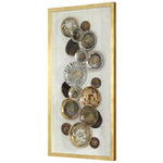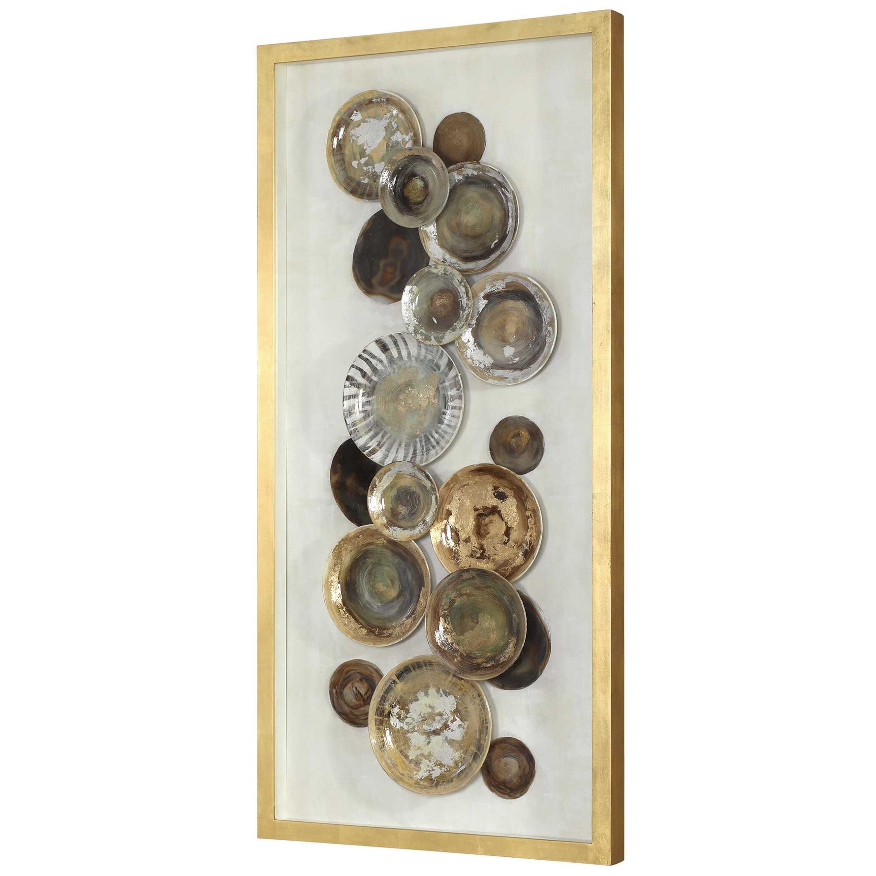 - A Collection Of Hand Painted Multicolored Plates, Artfully Arranged Over A White Backing, Mounted In A Metallic Gold Leaf Finished Pine Wood Shadow Box.