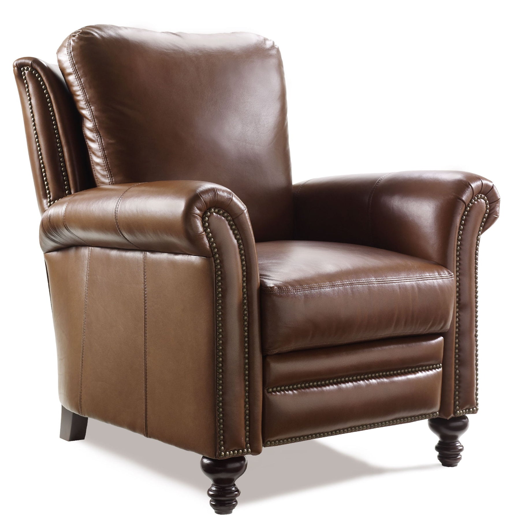 Unit price perThe Richardson High Leg Reclining Lounger is offered in hundreds of leather options and includes a standard nailhead trim #9 in natural finish. Other decorative nailhead finishes are available. Comes with a standard mahogany finish but other finishes are available. It features a semi-attached seat back and a high resilient foam seat. Power recline is available for an upcharge.
